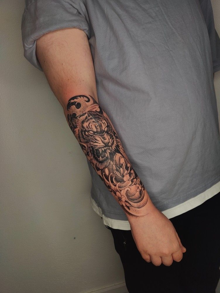 Covering the forearm from wrist to elbow, this piece is all about presence. The dark shading, intricate details, and swirling background art make the tiger the star of a bold sleeve design. It’s not just a tattoo—it’s a full statement piece that feels complete on its own.