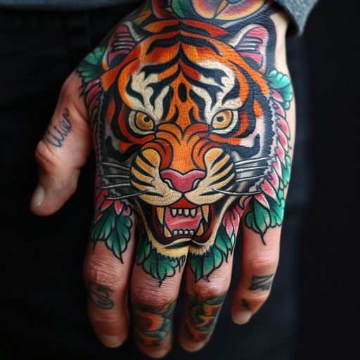 A strong feeling of defiance arises when the tiger’s roar resonates across practically the entire hand- it is fearless, wild, and unapologetically bold. It showers power upon you, its fiery orange tones opposed with luxuriant green hues of fresh nature. This tattoo is beyond mere styling; it screams strength and confidence-an aura majestic enough for you to walk into any room with your head held high.