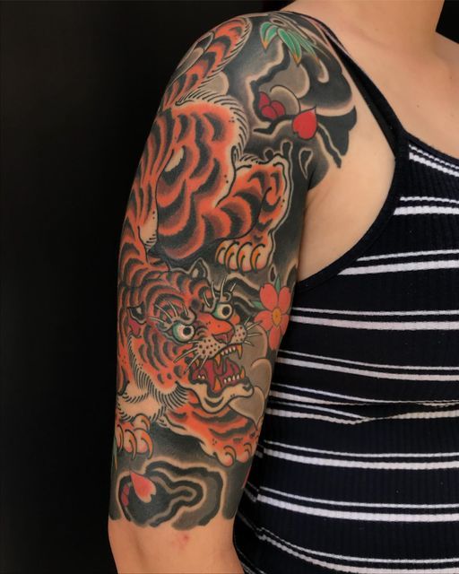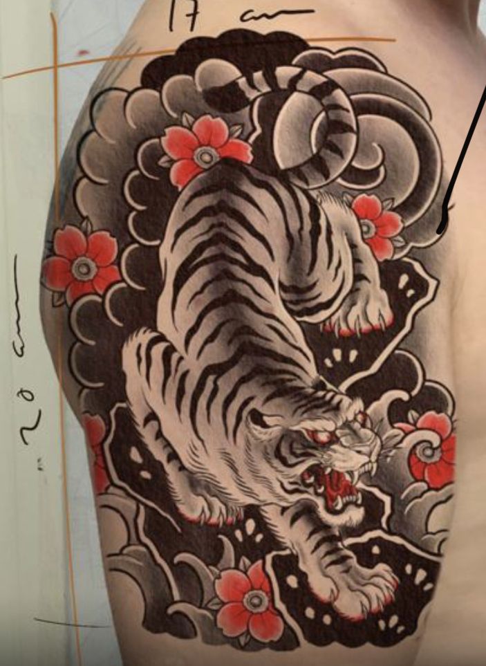 Covering the entire length of the upper arm, this majestic design is layered with the customary bucket shading of black, fiery clouds, and splashes of red flowers. The huge feline, appearing very potent and intimidating, seems to be almost climbing down the arm. It is bold yet firmly rooted in classic Japanese traditional design.