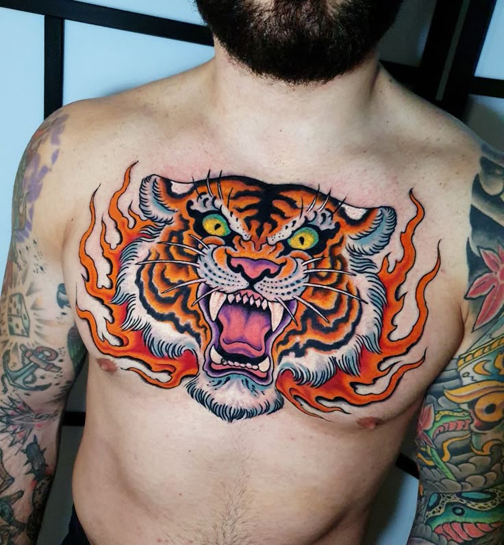 This chest piece is dramatic and unmissable—a roaring tiger face surrounded by fiery accents that burn with intensity. The sharp eyes, bold stripes, and hot flames make it feel like pure adrenaline inked into the skin. It’s unapologetic, commanding, and meant for someone who loves the spotlight.