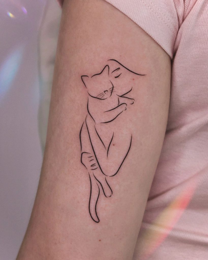 This cute little design is a great way to showcase that your heart is with your cat if this is what matters most to you as a pet owner. This simple design depicts a woman and her cat in a single embrace that is a warm hug that you long to come home to at the end of a long day.