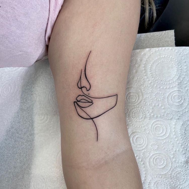 This small tattoo of a face done in one continuous line is a great way to turn the interior of the arm into a secret gallery of the soul. This is particularly striking in a tattoo that suggests a nose, a mouth, and a sharp jawline rather than explicitly defining them—leaving much to the imagination. It is petite, feminine, elegant, and fine—and, in fact, looks as if a budding artist buddy doodled this in a late-night discussion over eggnog. To incorporate this line tattoo into a fashion statement, consider that this is a piece of jewelry as well. It is stunning when worn with rolled-up sleeves, simple bracelets, and a touch of lipstick in a mouth-shaped design. It combines well with denim garments and slips, as well as office attire, since this is a small piece of tattooing that is intricate in design with black stripes. Finish with small earrings or a chain to display a coordinated look that is effortlessly attained—it is ideal for women who appreciate minimalist fine tattooing.