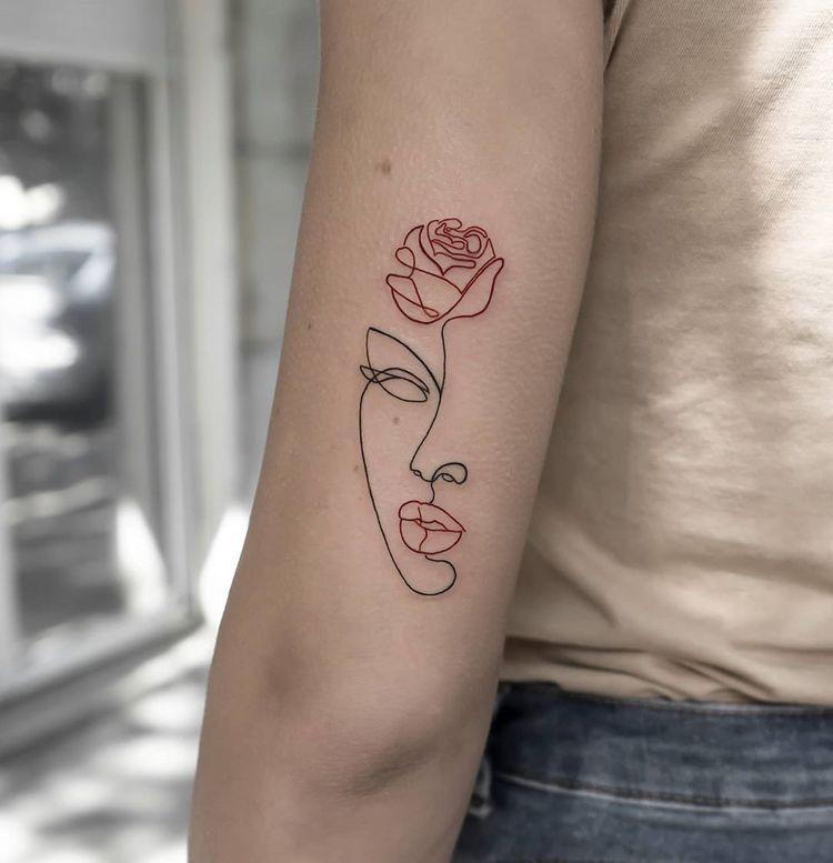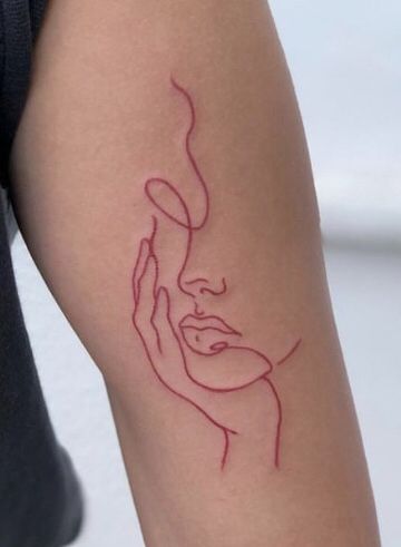 In this piece, a single red line traces the outline of a dreamy face as she rests in the palm of her own hand, as if daydreaming between cups of coffee. This swoop above her head is what makes it feel like a breath of imagination, a whisper that there is always something more happening than meets the eye. This tattoo remains perfectly feminine, a lilting rebellion that feels like a splash of lipstick in tattoo form. What is particularly unique about this design is that it has no need to communicate much. There is no additional detail, only a simple, small, thin outline that is meant to be accompanied by your story. This is a great way to place a tattoo of this sort in a location where it will come out from under short sleeves, as well as accompany small line artwork in the form of a small rose or music symbol if you wish to develop a subtle theme.