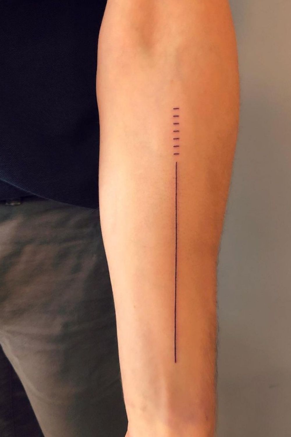 Compared with more decorative line tattoo ideas, this one leans strongly into geometric design. It’s a great alternative if you like minimalist fine pieces but don’t want another face or floral motif. The vertical placement subtly lengthens the arm, while the small marks add rhythm and interest. It would pair well with other straight-line tattoos, especially for men or women who want a cohesive, almost architectural look on their skin.