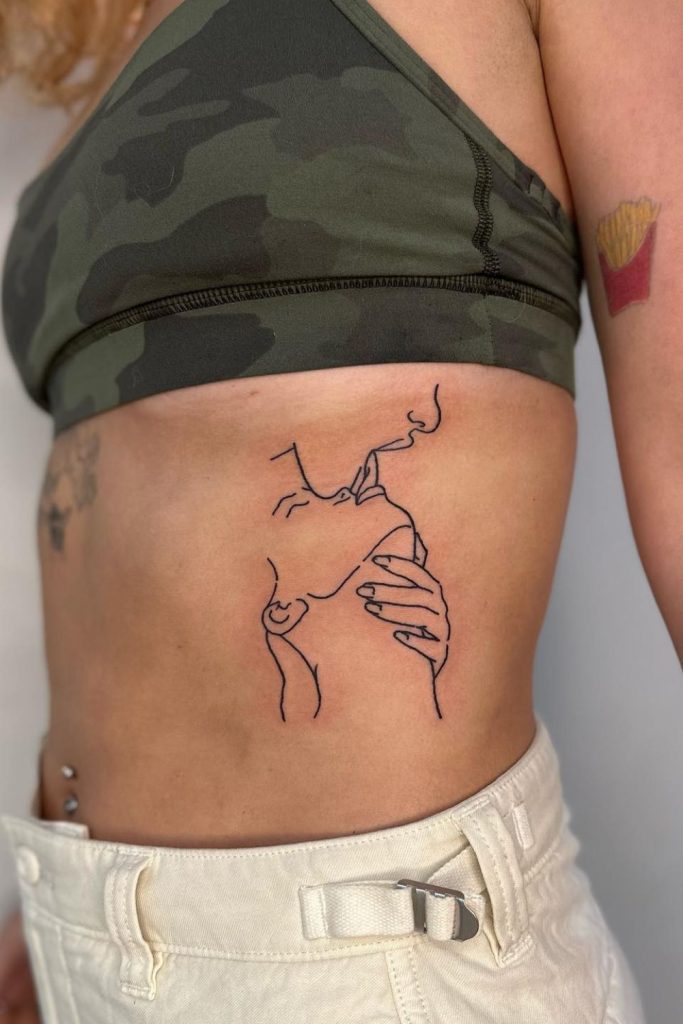 What is particularly interesting about this design is that it is specifically designed for couples as well as individuals as a representation of self-love. This is ideal, as the long vertical design is flattering to the body, as well as the small details in the lips and fingers that keep this design beautiful rather than ugly. A simple black outline keeps this design timeless, with the ability to add a small red feature if a representation of lipstick or lingerie is added in a way that keeps the design simple.