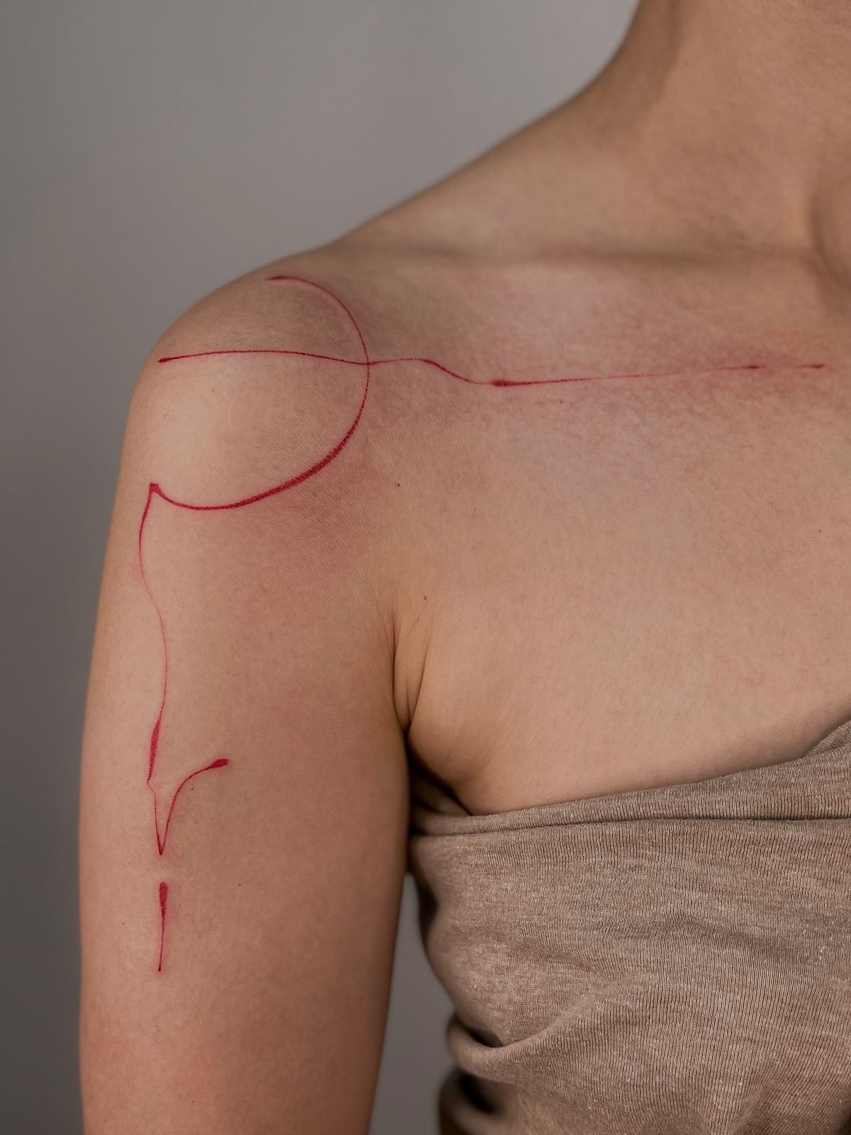 This red line stretches across the shoulder, tracing the outline of the shoulder before drifting downwards towards the sleeve of the arm in small dots that evoke a kind of beautiful line across one’s body as if a designer’s pen had sketched one’s shoulder out. This is where the emotional reward of a tattoo of this sort comes in: it can help make you stand a little straighter, noticing the beautiful angles of your shoulders and arms. Because of the way that this tattoo highlights natural angles, this kind of tattoo will look great on a variety of body types, particularly when worn with off-the-shoulder tops or strappy dresses. It is a great, subtle way to feel like a fierce, together woman even when you’re not making much of an effort in terms of clothing.