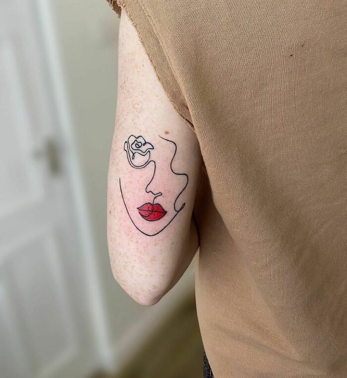 This is a rather cute cartoon-style tattoo where a one-lined face comes with a set of bright red lips as well as a small rose planted where one eye is supposed to be. This particular tattoo comes across as rather flirty and rather artistic and looks as if a certain fashion illustration came to inhabit the body of a tattoo that settled on the back of your hand. So if you’ve been considering a tattoo but haven’t taken the leap yet, consider this a little encouragement. This tattoo is small and intricate yet full of attitude, and since it’s located in a spot where the upper sleeve can cover it if needed, this is easily a tattoo that can be shared with the world or kept tucked away if that’s what makes you happy. It is one of those tattoos that will always encourage you to remember to keep things fun and fearless even on a plain old Tuesday. As a minimalist gal who appreciates artwork in general, as well as a gal who is looking for a simple yet interesting tattoo design, this is a great place to start—not to mention continue—the tattoo adventure of a lifetime.