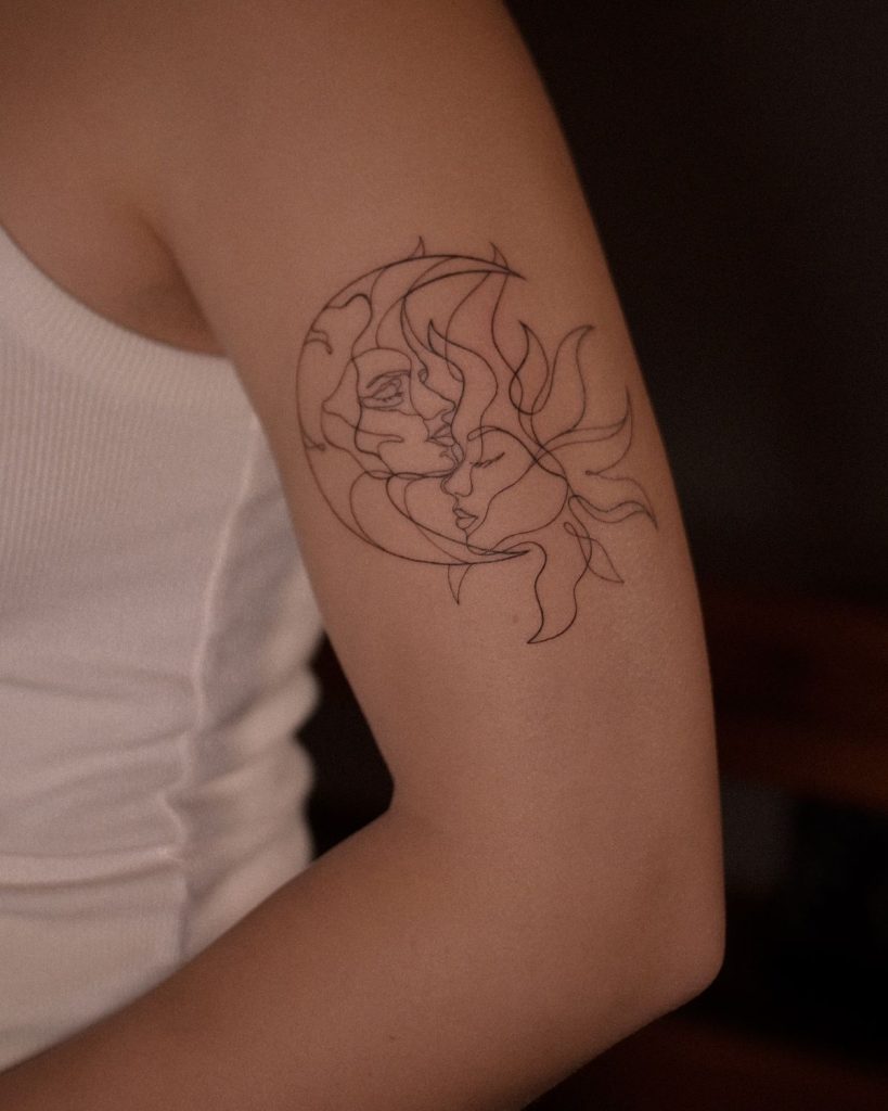 Here, the sun and the moon twist into each other as lovers who understand every one of your moods but choose to stick around nonetheless. This sketch of the sun and the moon, coupled with a continuous line used in defining the features of the sun and the moon, is dreamy and romantic, as well as fleeting, as if someone had managed to capture a moment between exhaling and inhaling.