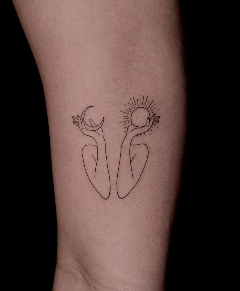 This delicate line tattoo feels like a quiet little ritual on your skin: one hand cradling the crescent moon, the other lifting the glowing sun. It’s the kind of minimalist drawing that says you’ve lived enough life to know you can hold both softness and strength at the same time. The gentle curves keep it feminine without being overly sweet, so it works whether you’re a bookish introvert or a bold female who loves a statement.