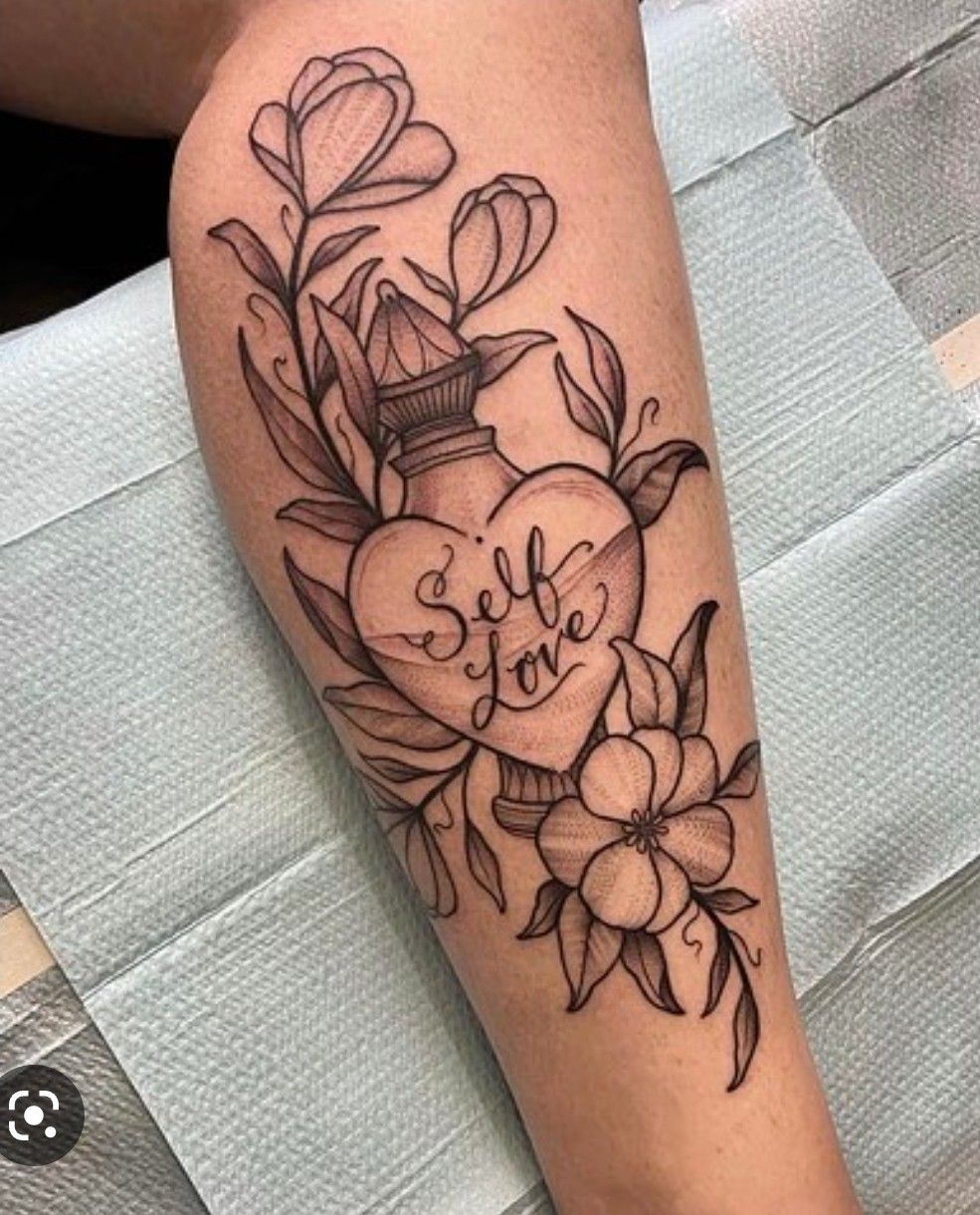 This heart-shaped tattoo feels warm, romantic, and emotionally expressive—surrounded by flowers and soft shading that give it a gentle, sentimental mood. It carries a message of self-worth, love, and personal growth.