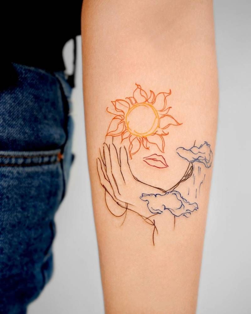 This tattoo blends surreal beauty with soft symbolism—a face partially hidden by a glowing sun and drifting clouds. It feels dreamy, artistic, and emotionally rich, like a visual poem about identity and light.