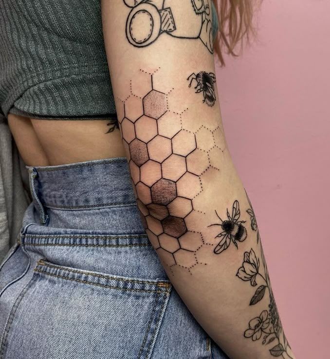 This tattoo blends geometric precision with nature-inspired details, creating a visually striking balance between structure and softness. The honeycomb pattern gives it a modern, design-focused edge, while the bees and floral accents add life, symbolism, and a touch of sweetness. It feels thoughtful, contemporary, and quietly artistic.