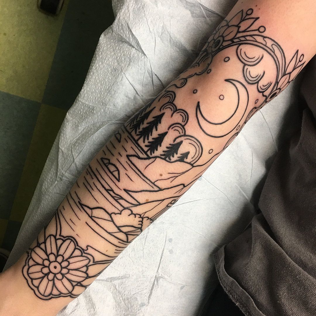 This large-scale tattoo captures a peaceful nighttime landscape—moon, mountains, trees, and clouds drawn in flowing, rhythmic lines. It feels cinematic and serene, like carrying a quiet story along your arm.