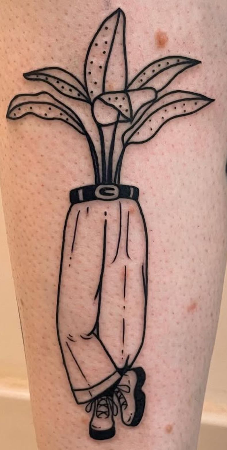 This playful line tattoo has a quirky, artistic personality—a simple plant emerging from trousers, drawn with bold outlines and a slightly surreal tone. It feels lighthearted, creative, and refreshingly unexpected, like wearable art that doesn’t take itself too seriously while still being stylish.