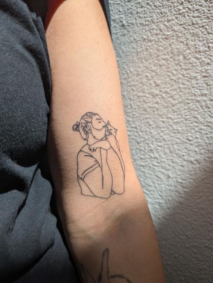 This delicate tattoo feels intimate and tender—a quiet moment between a woman and her cat, captured in soft, continuous lines. It has a poetic, feminine mood, like a personal memory frozen in a gentle sketch. The simplicity makes it feel honest, emotional, and effortlessly stylish.