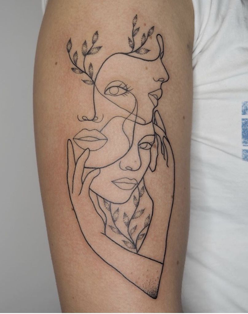 This layered face tattoo feels deeply artistic—like emotions and identities overlapping in a single flowing sketch. The continuous fine lines create a dreamlike mood, giving it a modern, gallery-worthy presence on skin.