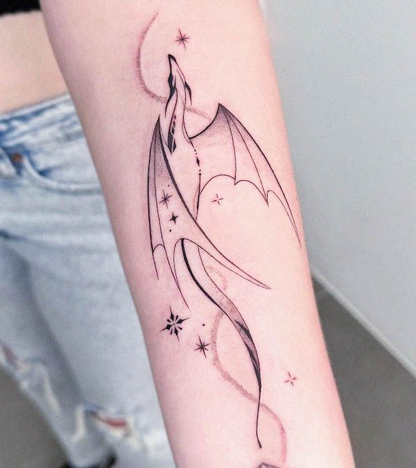 This dragon tattoo feels mystical and ethereal—a graceful creature rising toward the moon, surrounded by stars and flowing motion. The fine lines give it a dreamy, weightless quality, almost like a fantasy sketch brought gently onto skin. It carries a sense of magic, ambition, and quiet power.