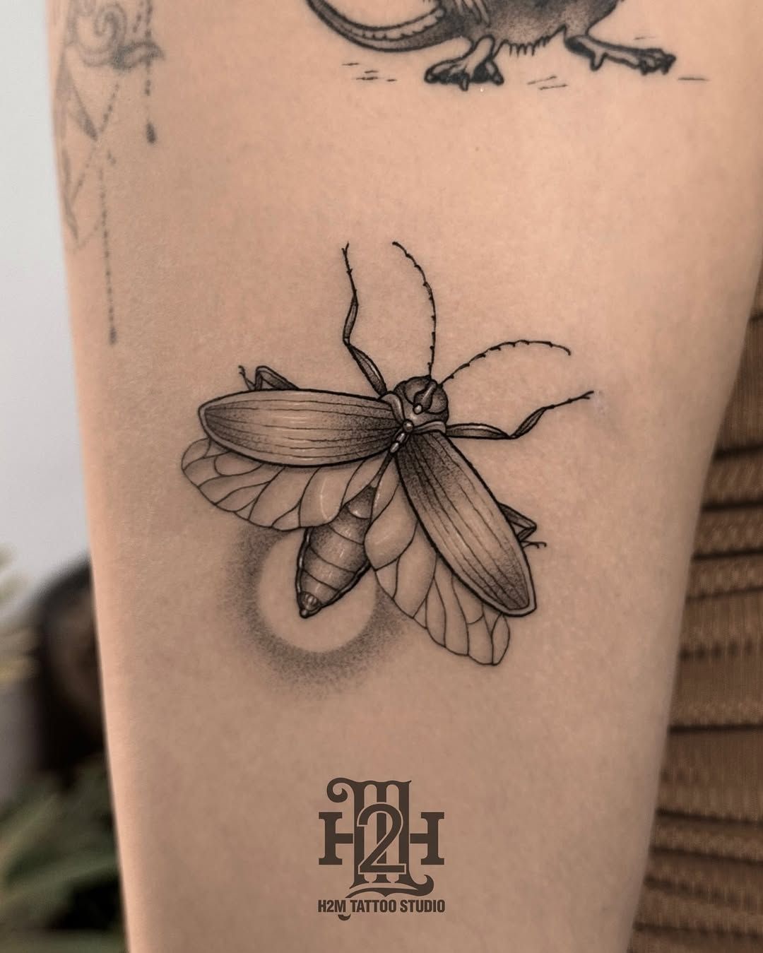 This beetle tattoo feels both mysterious and refined—detailed wings, soft shading, and carefully layered line work that gives it depth without overwhelming the design. There’s a quiet strength in this piece, symbolizing resilience, transformation, and natural beauty.