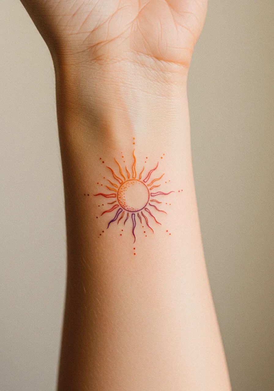 This is a great women’s tattoo idea for wrist or inner arm placements where color and fine line detail can shine. It pairs beautifully with other minimal designs and works well for anyone who wants something bright, meaningful, and emotionally uplifting.