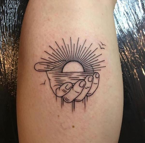 This tattoo carries a powerful emotional message—hands gently holding a radiant sun, symbolizing hope, care, and personal strength. The clean line composition keeps it soulful without being overly complex, giving it a poetic, meaningful presence.