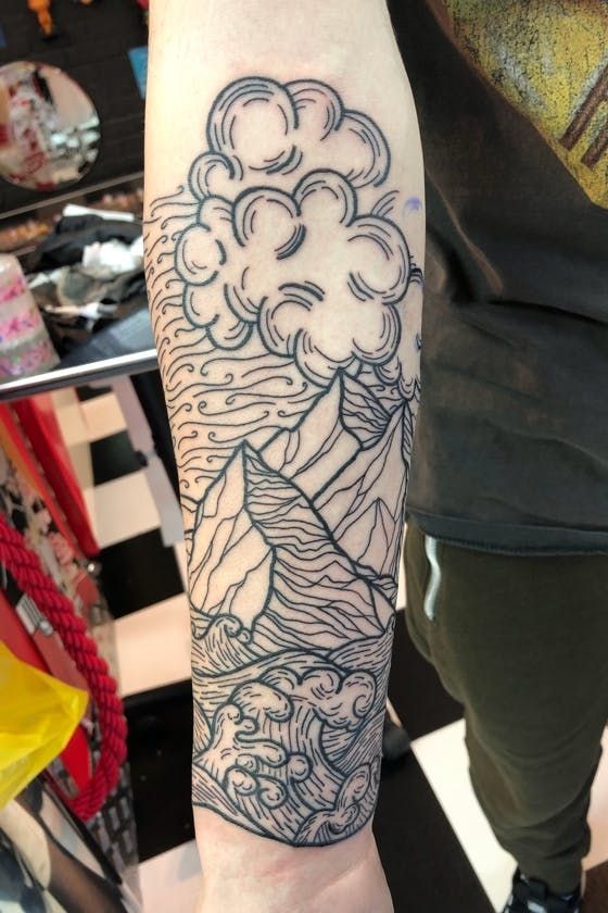 Inspired by Japanese art traditions, this tattoo combines rolling waves, layered mountains, and cloud motifs in a flowing line composition. It feels calm yet powerful, evoking nature, movement, and a timeless sense of harmony.