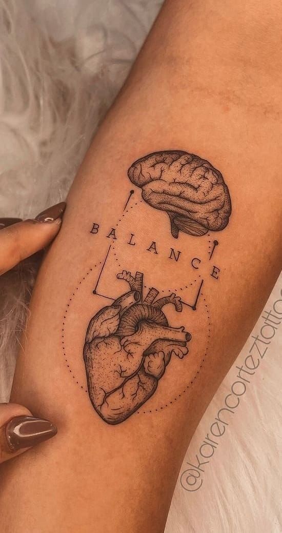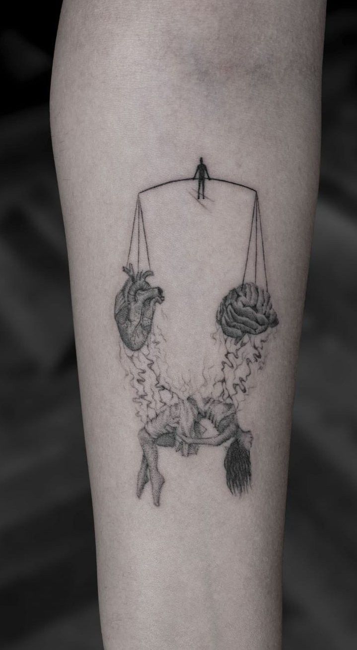 This tattoo feels poetic. A tiny figure balancing between a heart and a brain captures that constant internal negotiation—logic versus emotion. It’s delicate, thoughtful, and quietly profound.