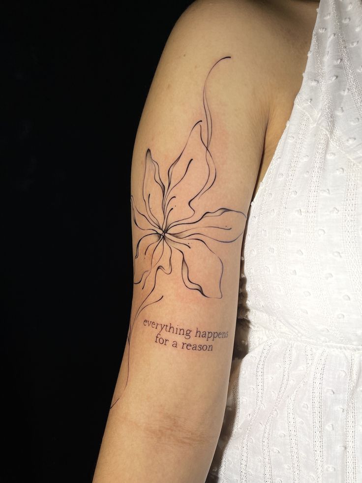 This tattoo feels calm, reflective, and quietly hopeful. The flowing flower paired with a simple phrase suggests acceptance rather than resistance. It doesn’t rush healing or demand optimism—it gently invites trust in the process, even when things don’t make sense yet.