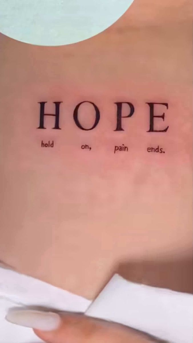 This tattoo hits you right in the chest—literally and emotionally. The word “hope” spaced out with smaller text underneath feels like a whisper instead of a demand. It doesn’t promise everything will be okay; it simply reminds you that pain has an ending. That kind of honesty is powerful, especially when life has tested your optimism more than once.