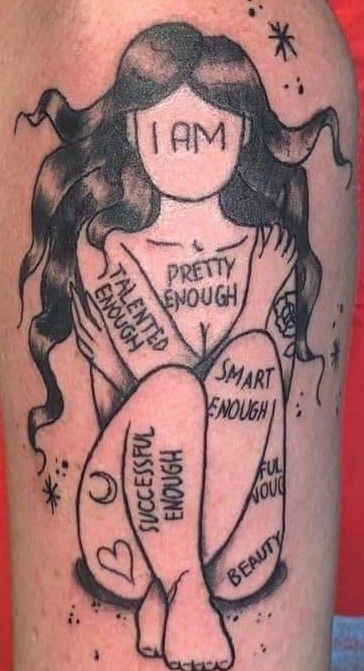 This tattoo is like a pep talk you carry with you. The words scattered across the body—pretty enough, smart enough, strong enough—feel like affirmations reclaimed after years of self-doubt. It’s bold, a little rebellious, and deeply empowering.