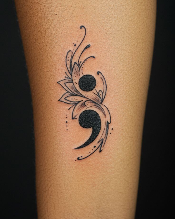 This design feels uplifting without being overly sentimental. The semicolon, already rich with meaning and softened by floral elements, suggests growth after struggle. It’s a continuation, not an ending—a visual reminder that choosing to keep going can also be beautiful.