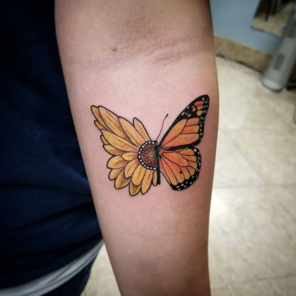 In 2025, this type of naturally leaning color work is all over the place, especially when it feels realistic and gently blurred rather than being overstroked. It may look high-end when it’s done by your artist, but ask him or her to layer color over time so the petals stay fluffy and butterfly wings sharp. A crisp stencil outline for the flower helps the shape last, particularly if you’d like the yellow tones to remain vibrant and unblurred.