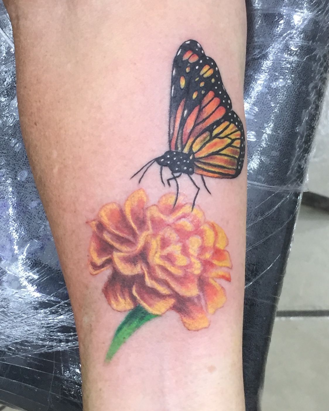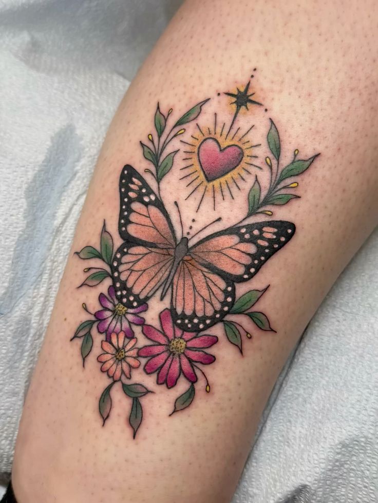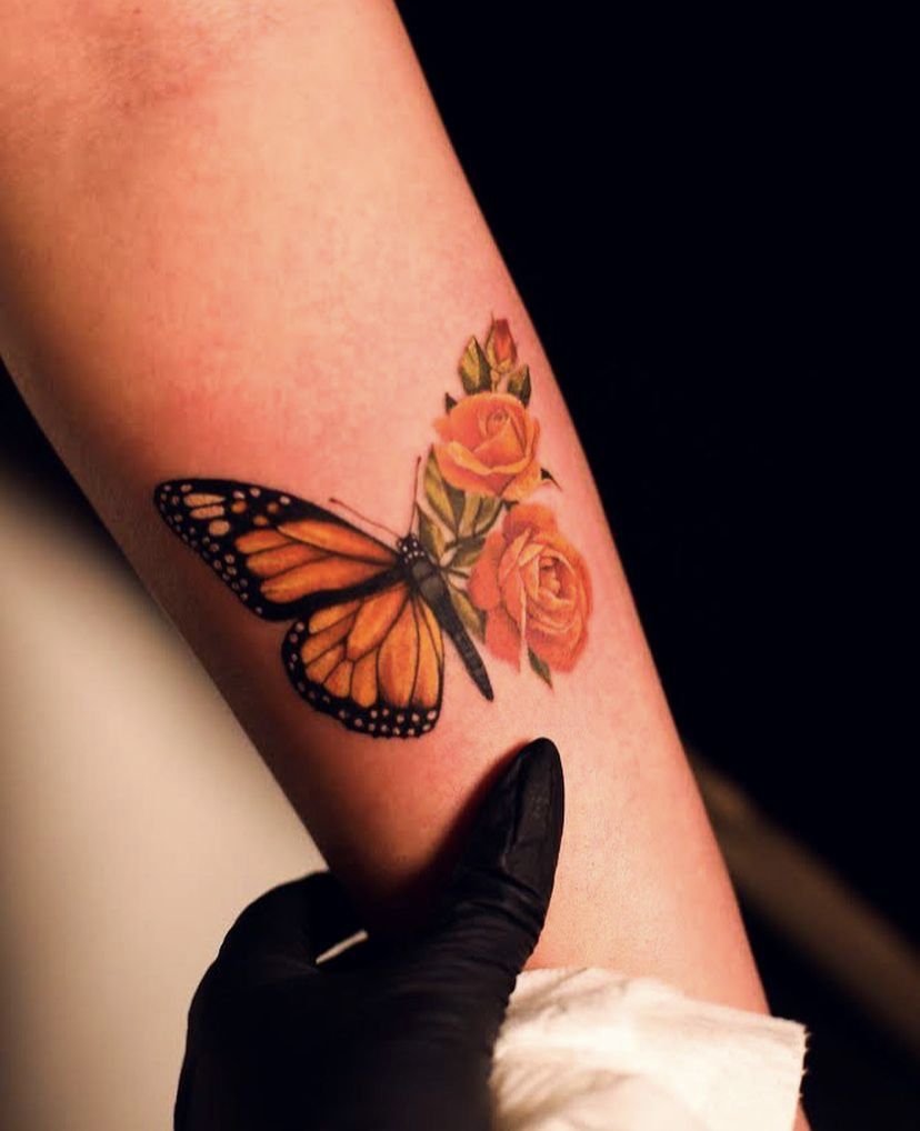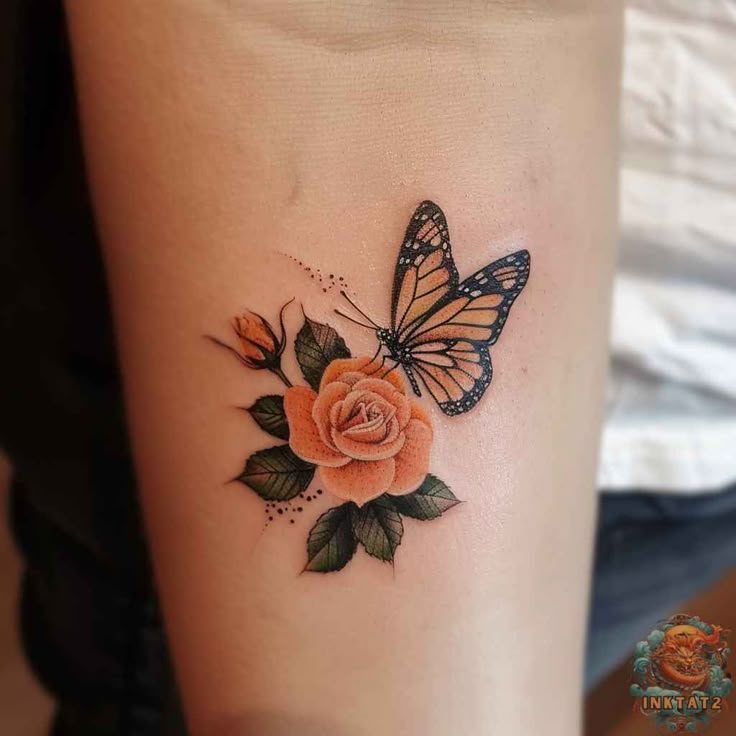 Adding flowers, meanwhile, provides you with a little more visual weight—you’ll have a composition that feels a bit more “finished” in terms of size and subject area—particularly if you want the tattoo to feel like an integrated piece rather than just some tiny flash. Keep the rose tones warm, and the butterfly orange and clean so nothing competes. Fine for the thigh or upper arm, where the rose petals can breathe and the monarch wings aren’t so confined.