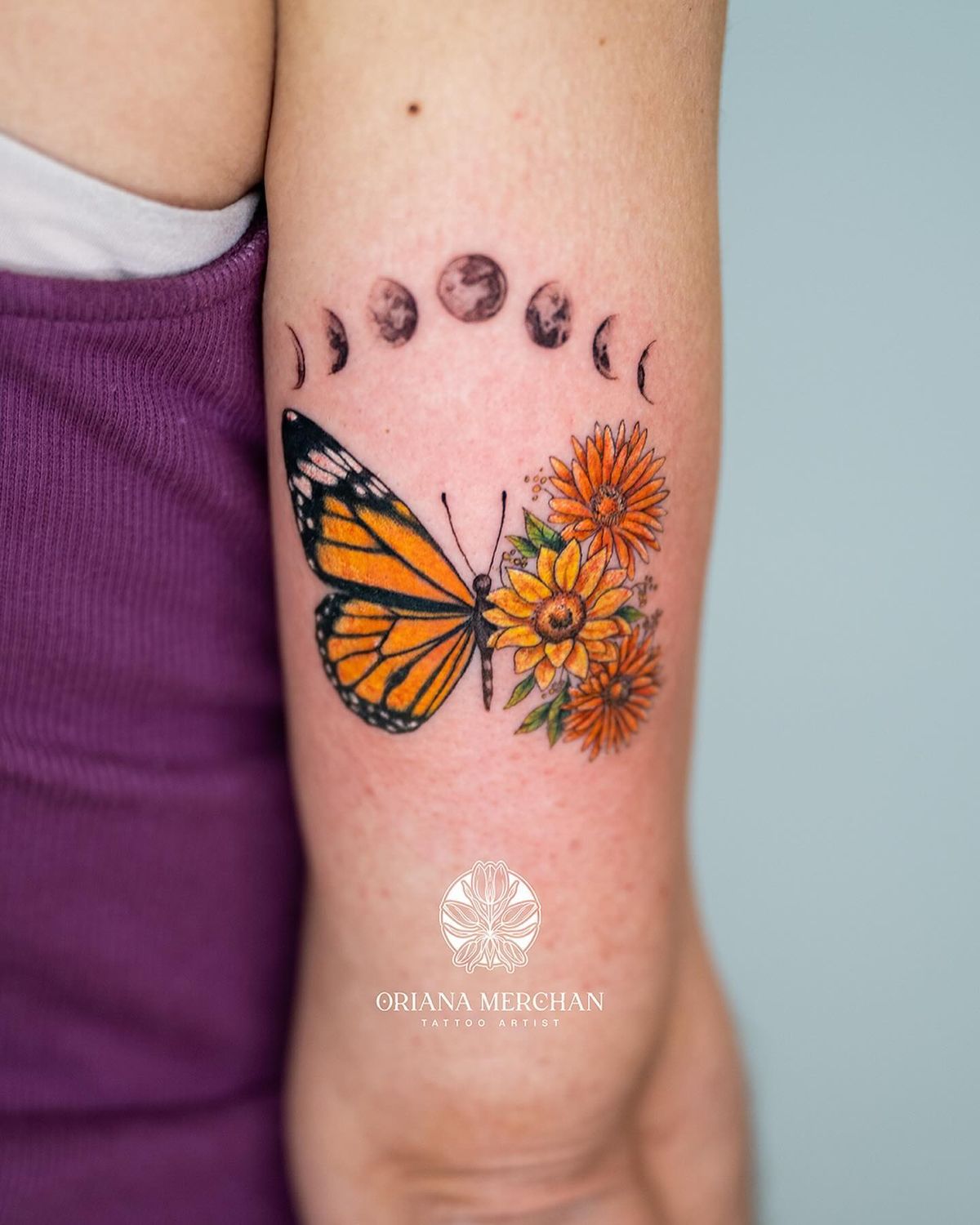 Style tips: Keep that linework crisp and those gradients smooth, especially along the sides where the wings meet petals, so the color doesn’t blur into one big warm patch. This is a good one for flowers on people who wanted a statement but not quite the full sleeve—upper arm and outer forearm are both complementary because, like you say, the shapes can breathe. Have your artist outline the placement in stencil designs before stenciling on the moons so they remain evenly spaced, and add a dab of yellow at the center of each flower for even more glow.