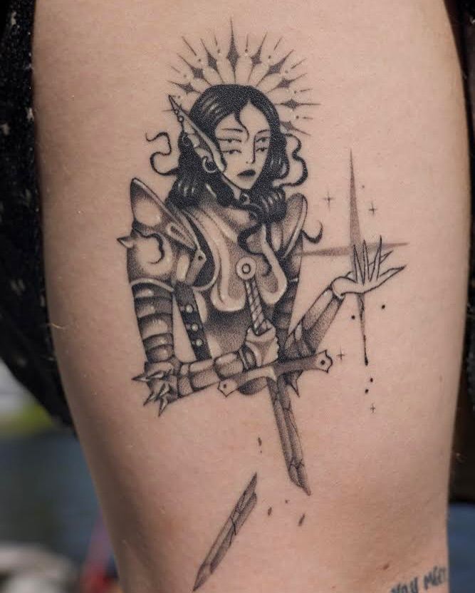 This tattoo feels like a modern warrior wrapped in magic—bold eyes, sharp armor, and an almost celestial aura surrounding her presence. The blend of Gothic mood and fantasy storytelling makes it feel intense yet empowering, like a symbol of personal battles fought and victories earned. It carries a sense of mystery, confidence, and unapologetic self-expression.