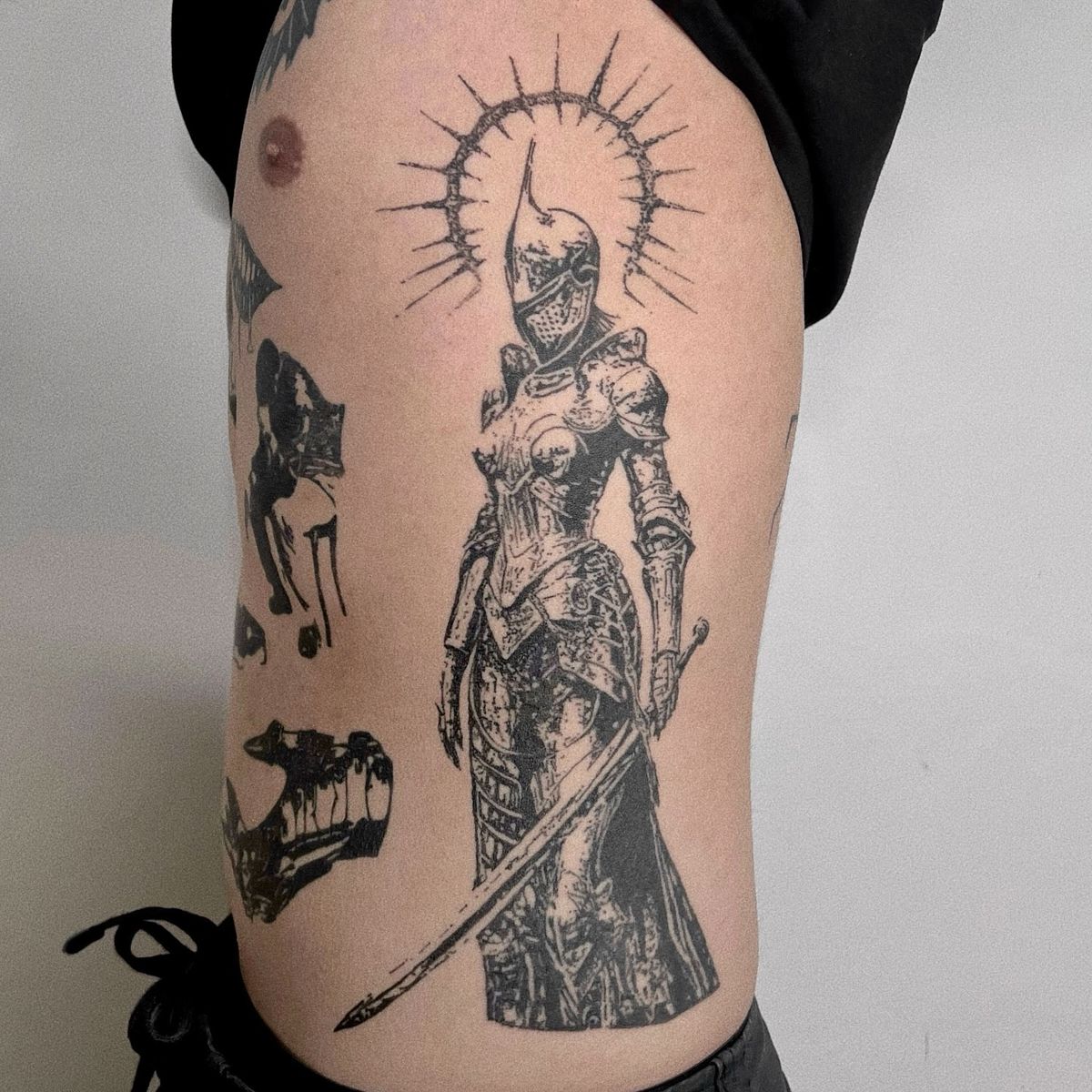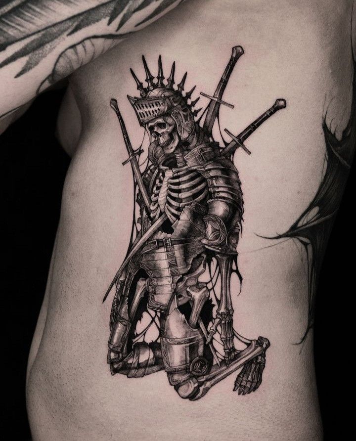 3. Medieval Knight Rib Tattoo with Dark Armor