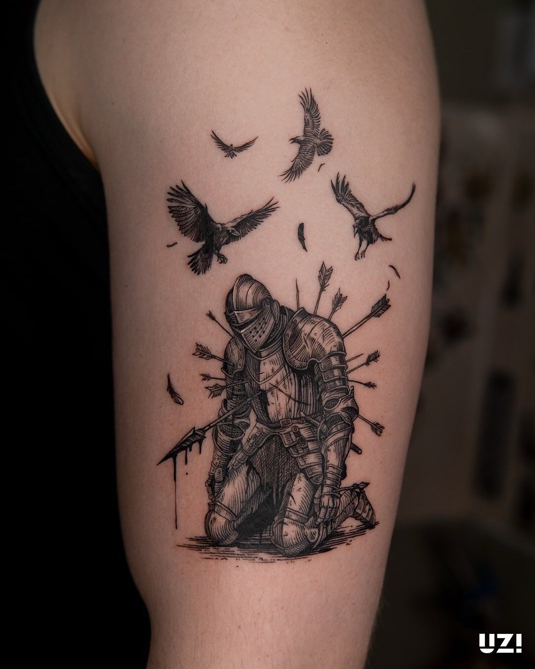 4. Kneeling Knight Tattoo with Ravens and Arrows