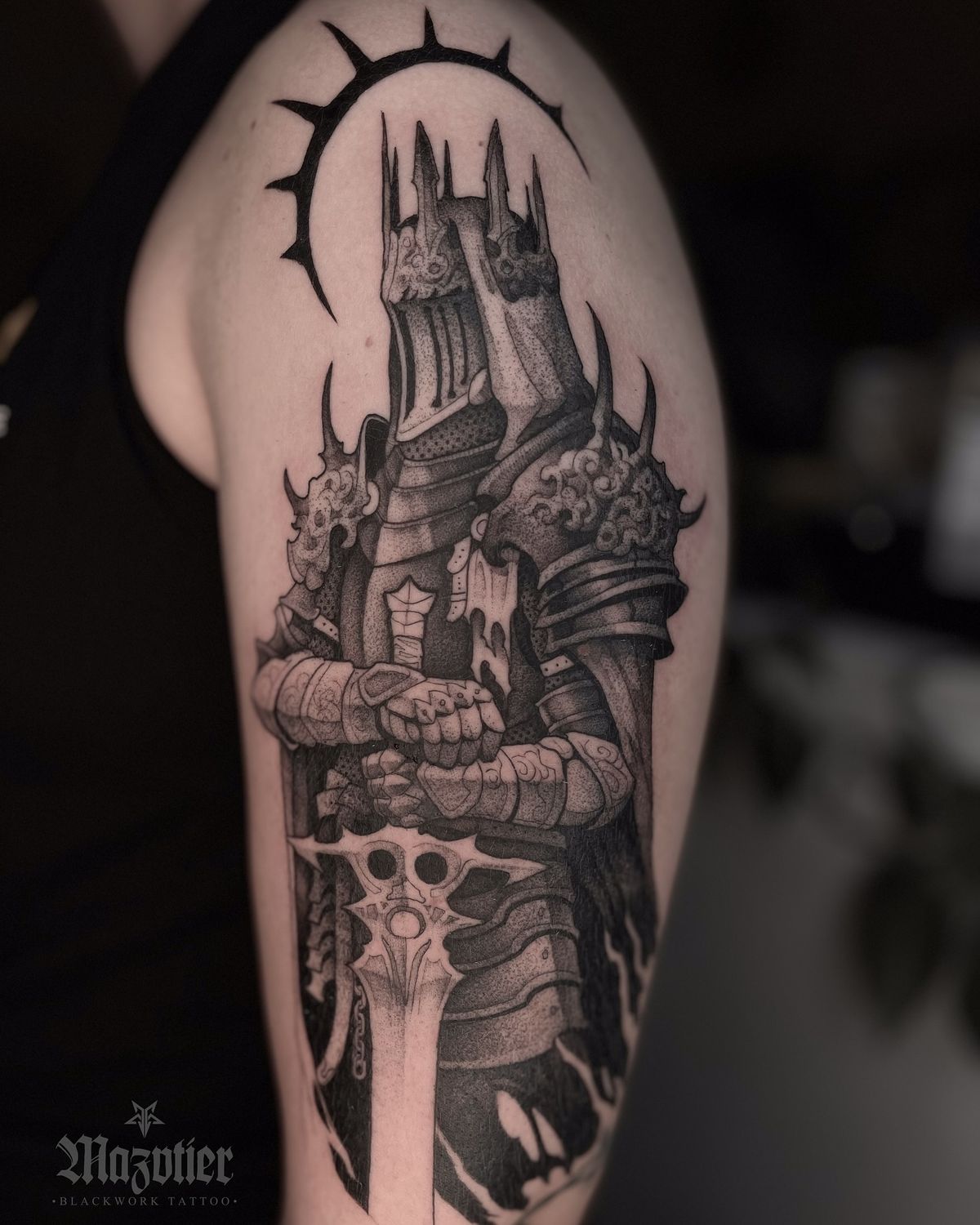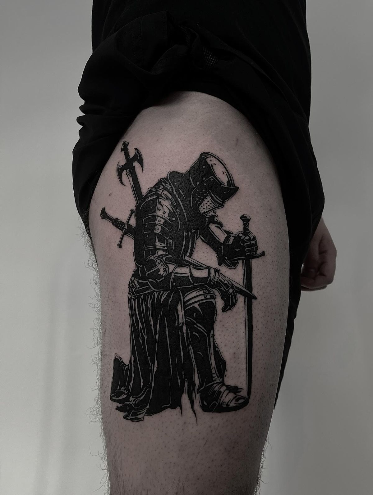 This tattoo is perfect for men who appreciate black ink, dark themes, and detailed medieval armor. It fits best on the upper arm or thigh, where the rich dotwork and layered shading can fully shine without crowding.