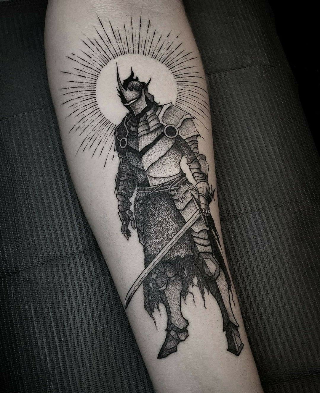 Compared to more traditional knight tattoos, this one stands out for its artistic originality and textured linework. It’s ideal for men who want something unconventional yet deeply medieval in spirit, especially on the arm or forearm, where details remain crisp.