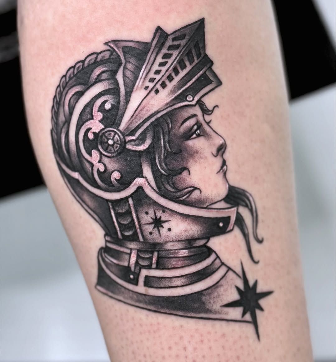 This tattoo feels refined, poetic, and quietly powerful—a lady knight captured in profile, gazing forward with calm confidence. The soft shading and subtle star details create an almost dreamy atmosphere, blending medieval strength with gentle elegance.