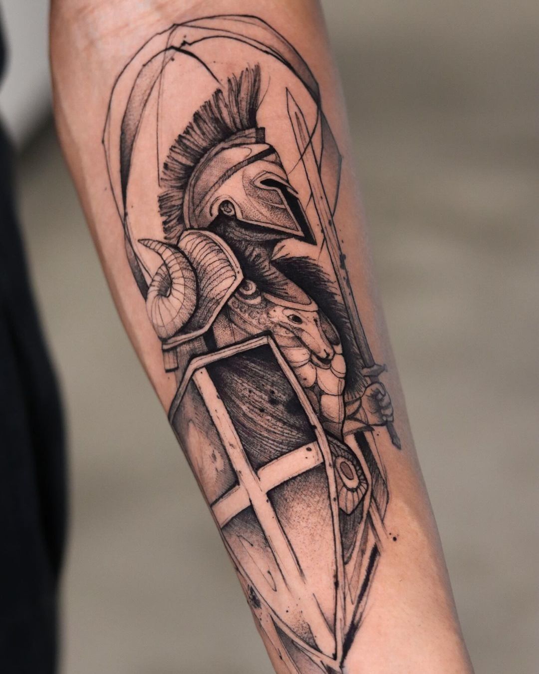 Compared to hyper-realistic knight tattoos, this one stands out for its simplicity and graphic clarity. It’s ideal for the arm, especially for those who love American traditional influences and strong, timeless outlines.