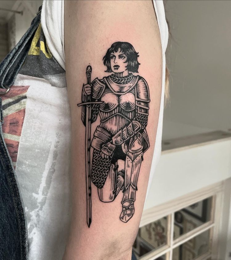 This tattoo has a nostalgic, retro charm—a female knight rendered in a Trad style that feels bold, confident, and refreshingly unique. It gives off a fearless, rebellious energy with a classic twist.
