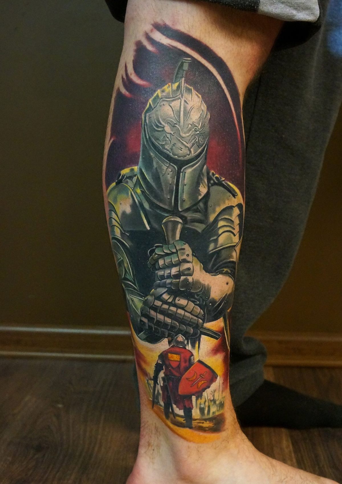 This piece carries a heavy Gothic atmosphere—dark armor, intricate textures, and a commanding presence that feels mysterious and authoritative. It’s the kind of tattoo that instantly reads as powerful and serious.
