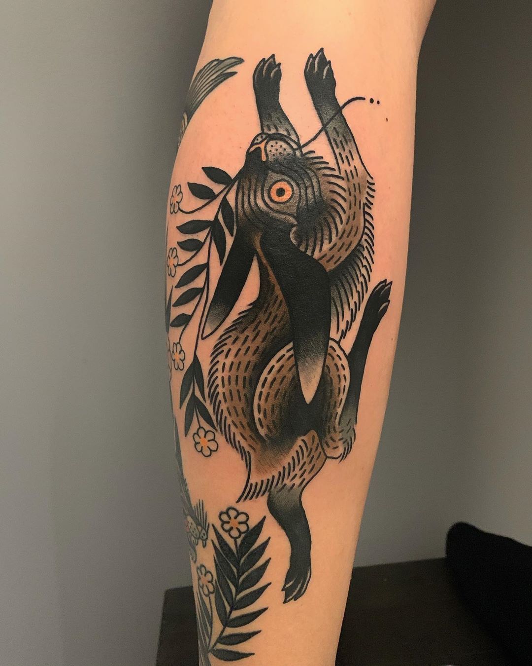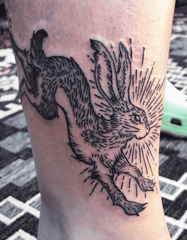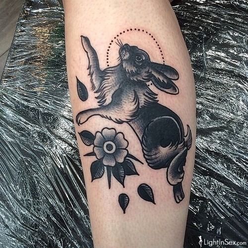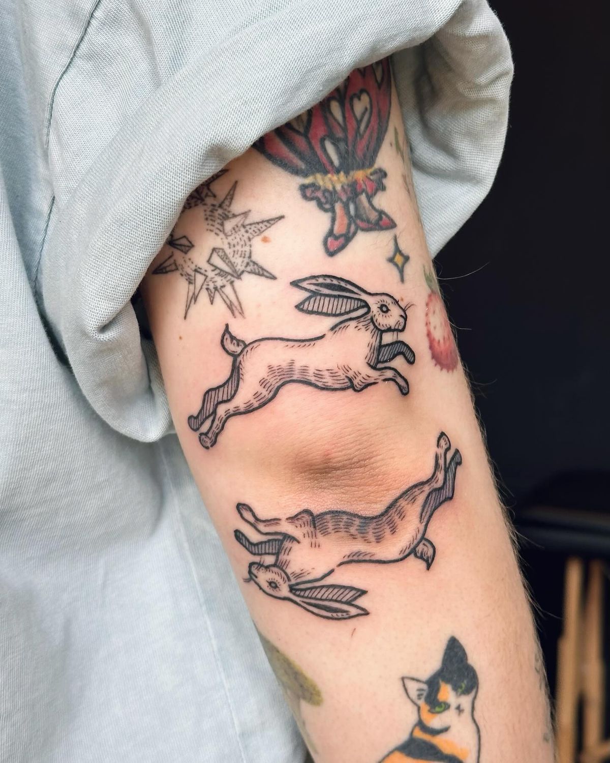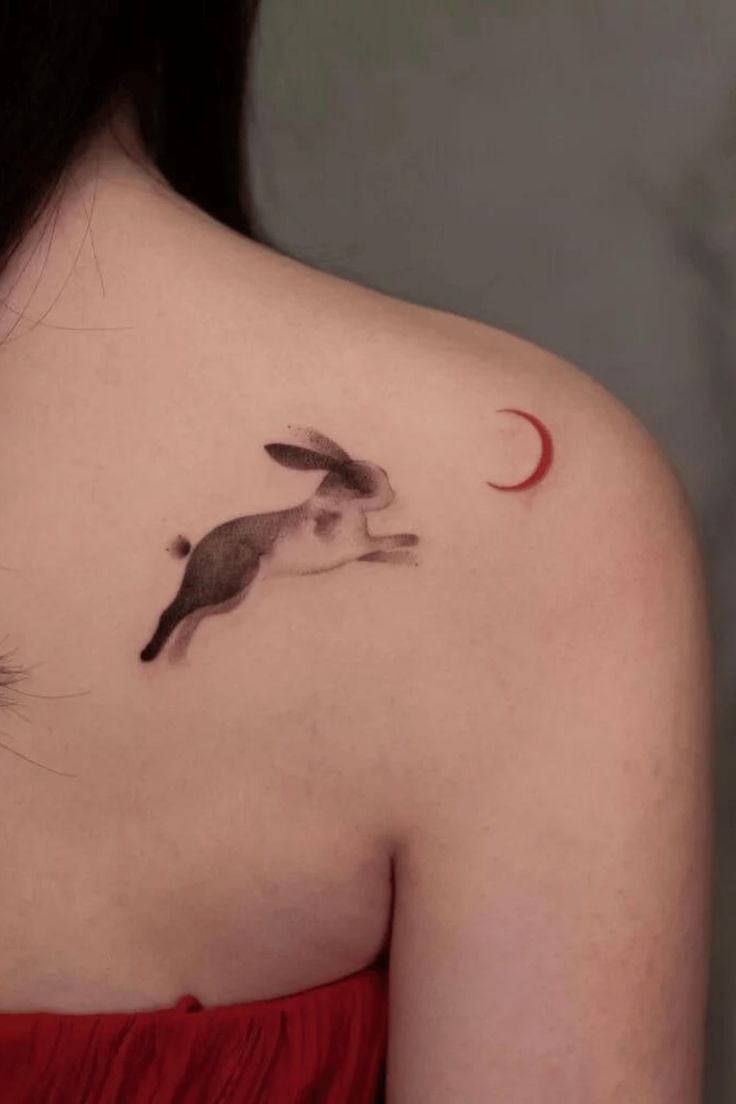Interested in sporting a new and lovely tattoo? These designs range from minimalist fine-line tattoos to bold American traditional hares integrated with lovely little flowers, delicate moons, and adorable running poses. For daily wear, you might find something simple and minimalistic, but for something romantic and storybook-esque, you will find something stylish and personal that suits your needs—especially for those who love nostalgia, luck, and artistic touches.