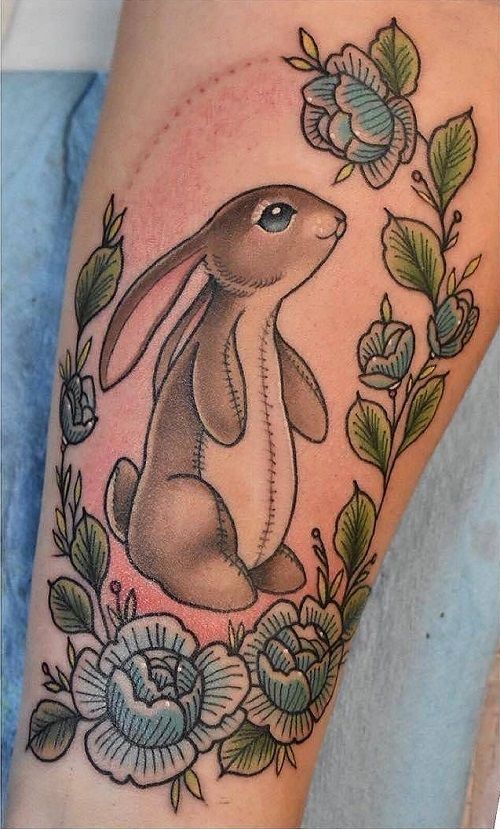 With its stitched belly and upright pose, this piece channels the Velveteen magic—the moment a beloved toy becomes real through love. Surrounded by vintage-style blooms, the rabbit looks hopeful and well-loved, a design that carries tenderness without turning sugary. It’s quietly radiant on the forearm, peeking from rolled sleeves like a little secret story. Trend note (2025): Story-driven tattoos are everywhere, and plush-inspired bunny motifs are leading the charge. Pairing soft toy details with garden elements keeps it timeless. Ask your artist for muted greens, dusty petals, and a fine stencil so edges stay neat; the look bridges minimalist roots with classic illustration for long-wearing charm.