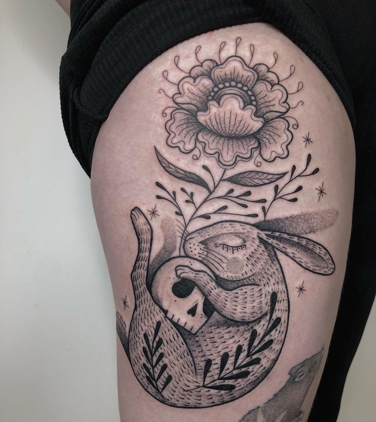 This patterned rabbit, half talisman half storybook, rests and blooms, sprinkled with small stars, beneath a colossal flower. There is something protective and mystic, something hand carved, earthy and reminiscent of a Japanese woodcut or a Chinese folk print, within the texture. It’s most dramatic on the thigh, where the motifs can sprawl. Low-maintenance angle: Bold stipple and confident shapes age beautifully. Opt for a clear stencil, solid Black fields, and minimal tiny lines. The design stays readable through time, making it a Lucky choice if you want longevity over micro detail.