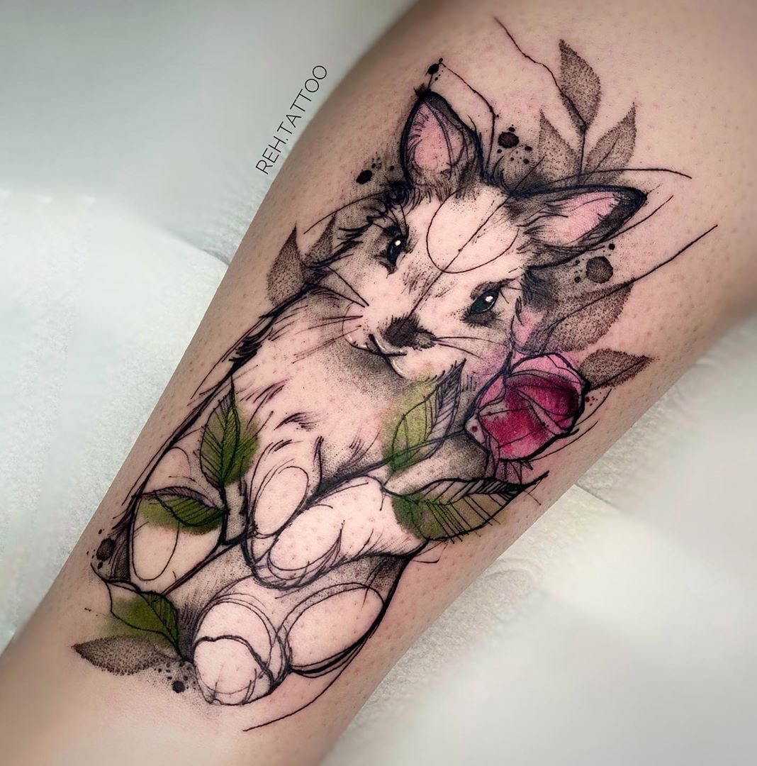 This piece looks ripped from an artist’s notebook—loose lines, inky splashes, and a gentle rabbit cuddled against a rosy bloom. The spontaneity gives it that lived-in charm, like a memory that refuses to fade. If you love art museums and Sunday markets, this design is your soft-rebellious signature. What makes it special: The contrast between airy watercolor and crisp contour keeps the design readable at mid size. Ask for breathable shading, focused Black only in the eye and whiskers, and a whisper of White to lift the petals. It’s an elegant alternative to american traditional when you want movement over structure.