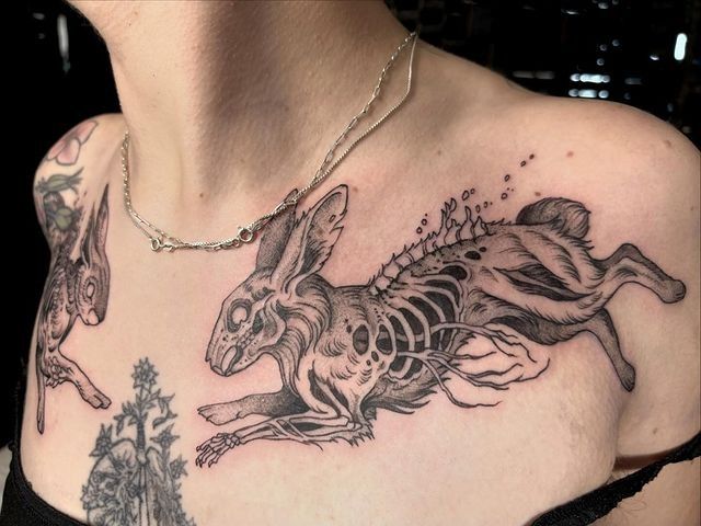 Fast, fierce, and beautifully strange, this Running rabbit reveals bones and sinew as it leaps across the collarbone. The airy linework and dotted motion trails give it a windswept quality, like a sketch that couldn’t sit still. It’s an art-forward design for collectors who love a little edge—equal parts botanical diagram and storybook chase scene—and it tucks perfectly under necklaces or a scoop tee. Care & vibe: Collarbone skin is thin, so keep details crisp rather than micro. Ask for Fine line structure with selective Black shading inside the ribs to retain clarity over time. If you like american traditional but want something more experimental, this hybrid hits the mark. Add tiny stars, a sliver Moon, or a Jack style spark to extend the composition later without crowding the original ideas.