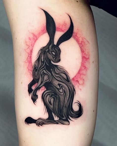 This upright hare feels carved from smoke—swirling textures inside a deep Black silhouette, haloed by a soft crimson Moon. It’s moody, elegant, and cinematic, the kind of piece that whispers folklore without naming it: a night guardian, a Lucky scout, a talisman for clear instinct. The contrast of inky body against the blush background keeps it modern while the long ears add that striking, almost ceremonial presence. What makes it special: The interior marbling gives depth without heavy outlines, so the design stays graphic yet fluid. Place it on thigh or upper arm for a clean vertical. Request a precise stencil, smooth black-packing, and just a breath of White catchlight near the eye for life. Pair later with a Fox and or small stars if you want a tiny constellation around your spirit hare.