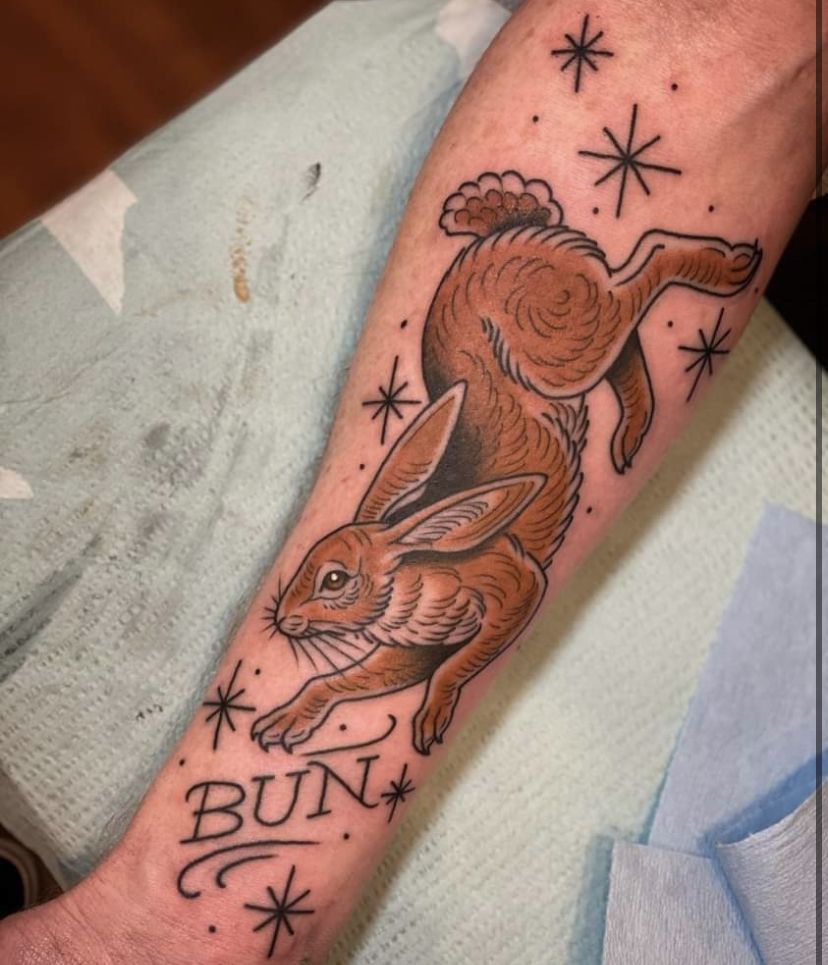 All motion and mischief, this rabbit kicks off with vintage sparkle stars and a playful script. The caramel fur and bold outlines give a friendly nod to American traditional while keeping the mood upbeat. It’s a design that looks fantastic on the forearm—easy to show, easy to hide, and always a conversation starter. The vibe: Adventurous, lively, and a touch retro. If you’re the friend who plans the weekend, this running motif is your spirit animal. Ask for a clean stencil and confident saturation so the stars pop; a small touch of white in the eye adds bounce without overcomplicating the art.