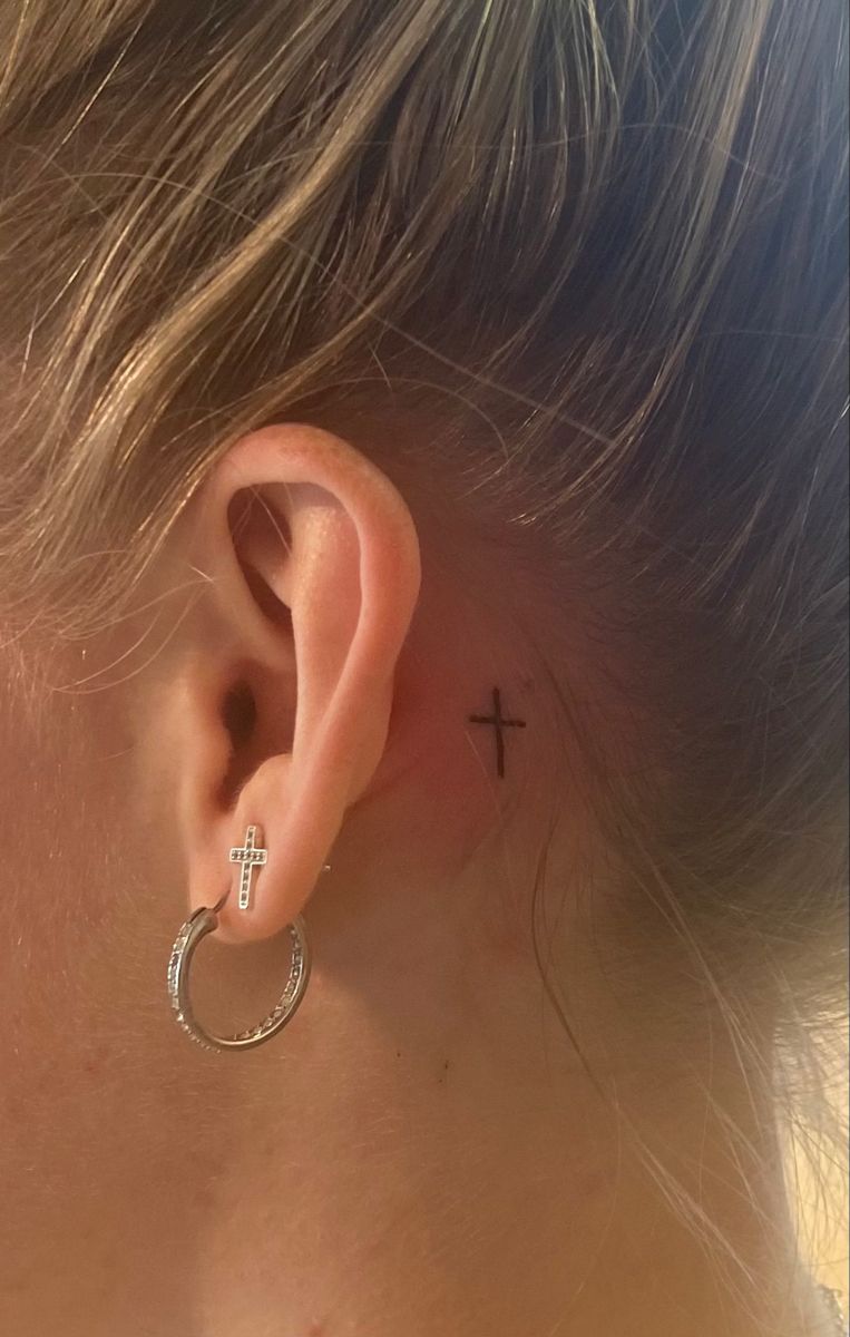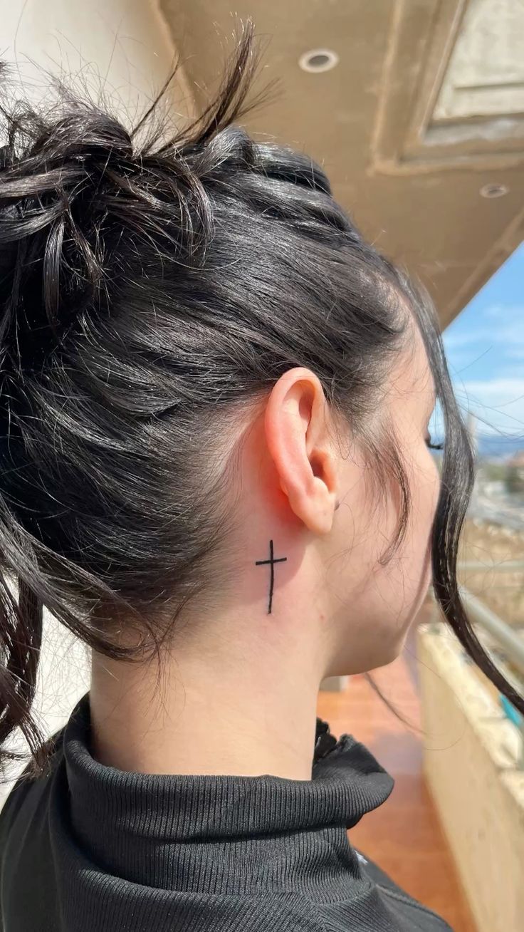 There’s a sweet, almost secretive charm to a tiny cross placed behind the ear. It stays hidden most of the time and appears only when hair is pulled back or caught by the wind. That little reveal gives the tattoo a playful and intimate personality.